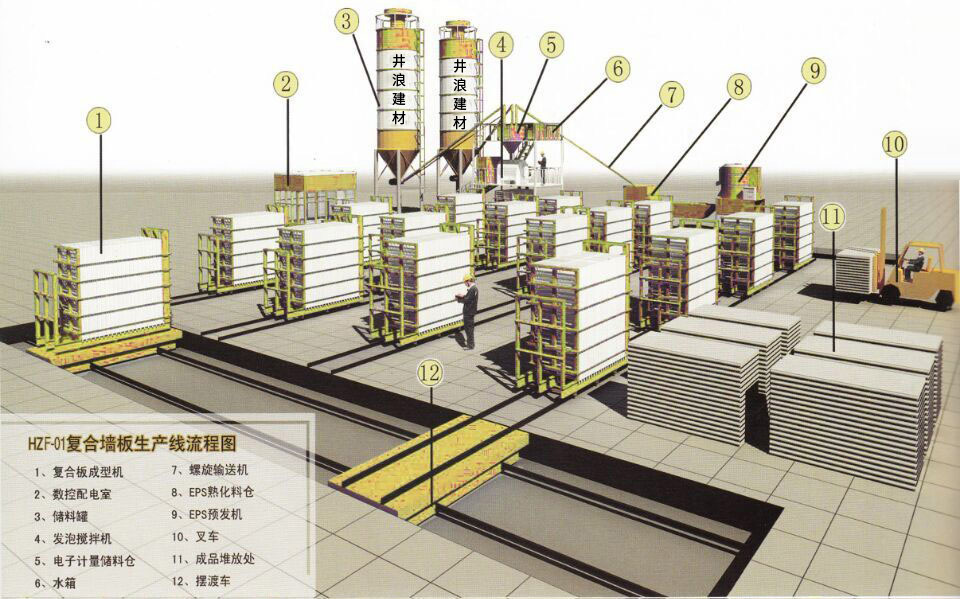 井浪輕質復合墻板生產線:高速裝模--改良攪拌--自動振搗--養護--機械拆模--包裝--入庫--出庫--運輸。